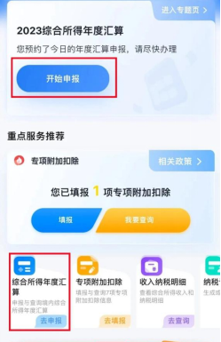 三、返回首页进入“综合所得年度汇算”,选择申报年度“2023年度”,选择填报方式。